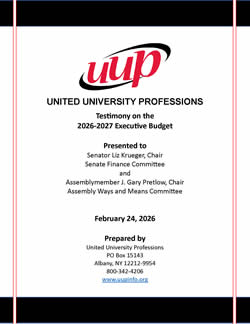 As part our union’s advocacy and educational outreach, the president of UUP or a designee appears before members of the legislature to testify on behalf of our membership. These hearings, along with our advocacy efforts, ensure that our members’ concerns and UUP’s legislative priorities are at the forefront of decisions being made in Albany. This testimony is critical to the visibility and presence of UUP during the Legislative Session and allows us the unique opportunity to make our members’ voices heard during the formulation of the state budget and other critical times in the legislative session. Click below to see previous testimonies and then click on our “Get Involved” page to see how you can contribute to the cause!